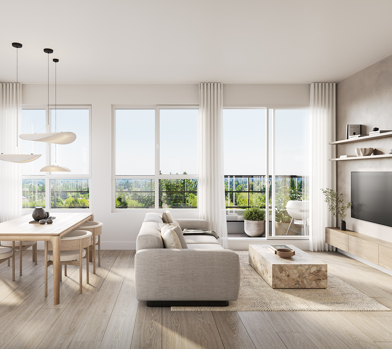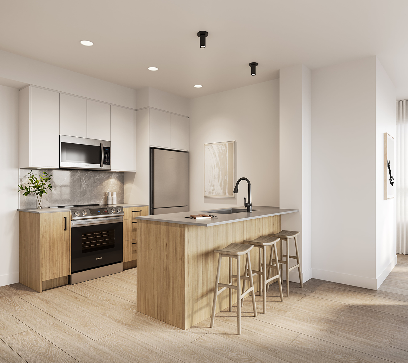 The kitchen countertops are adorned with stylish and durable Caesarstone in a raw concrete finish, adding an elemental touch to the interior design.