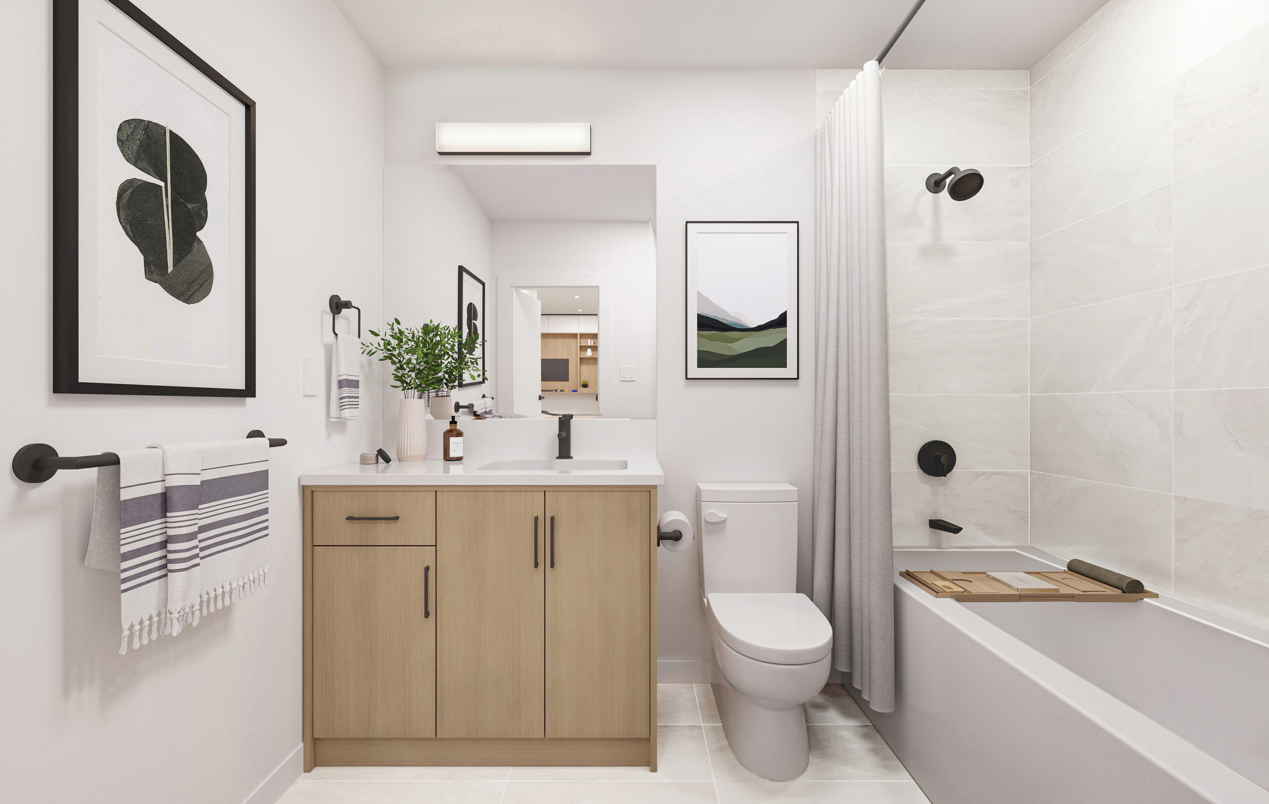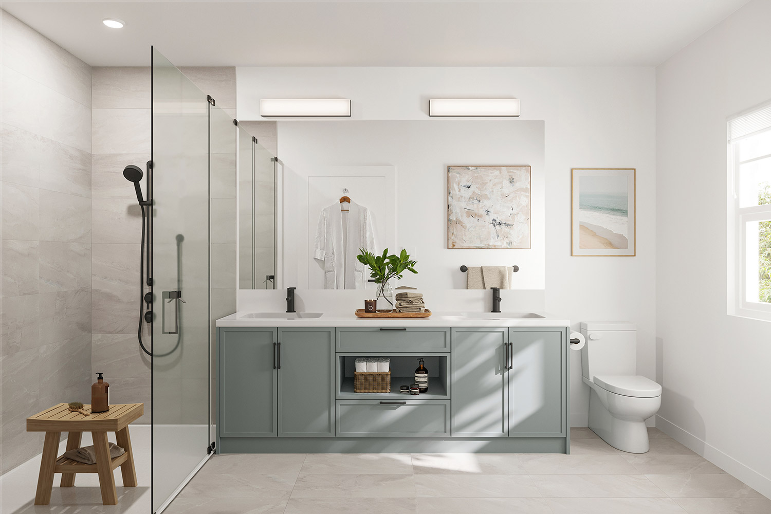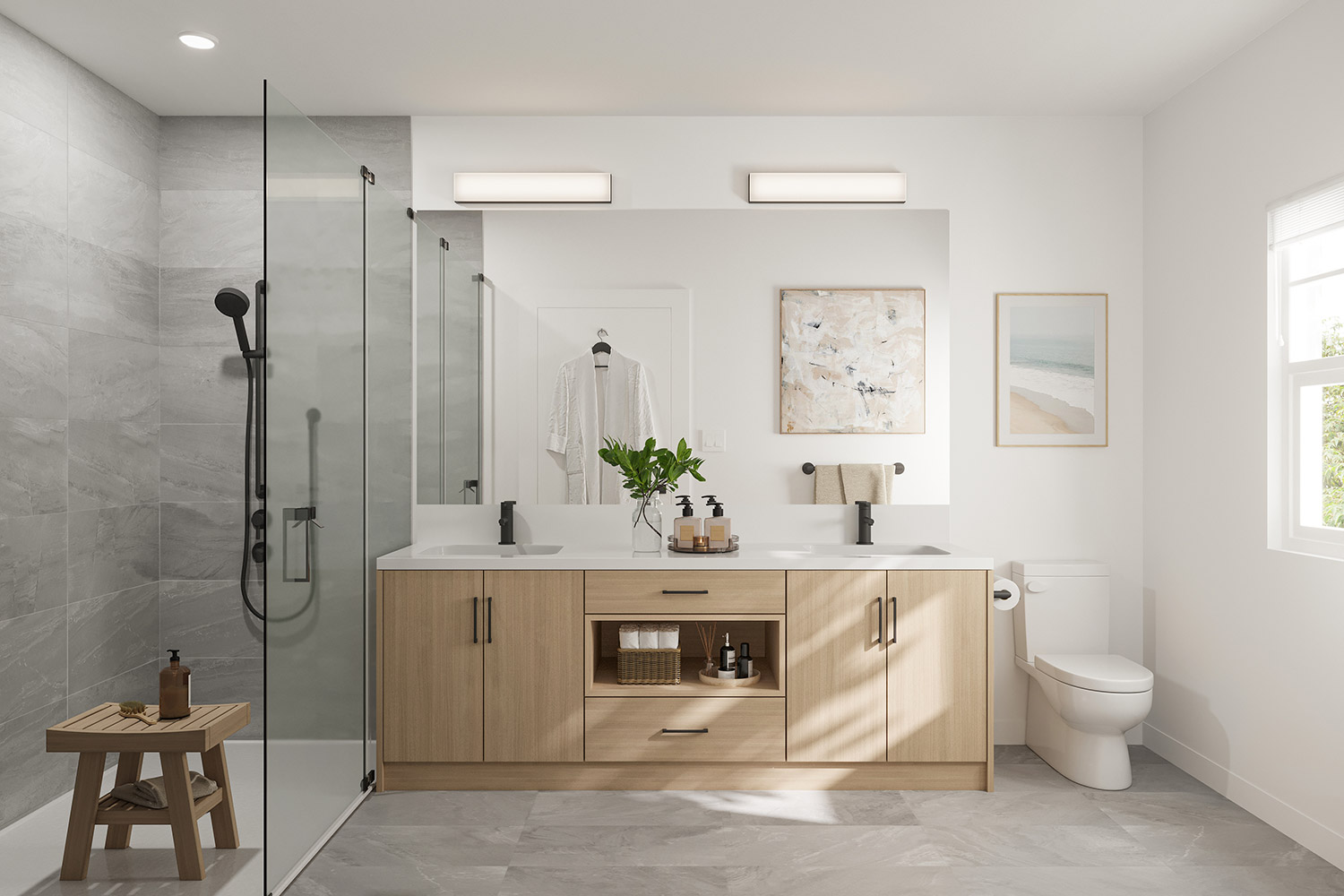 - Bright mirrors and cabinetry with soft-close drawers and doors.