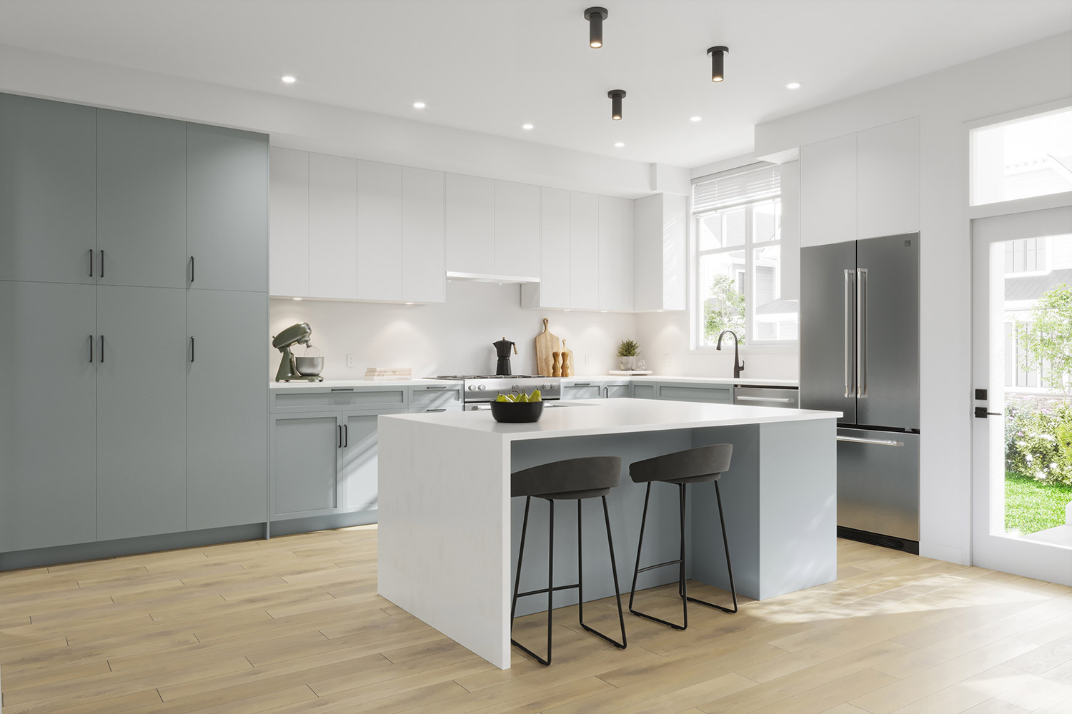 - Modern flat panel upper cabinetry, with base accent cabinetry.