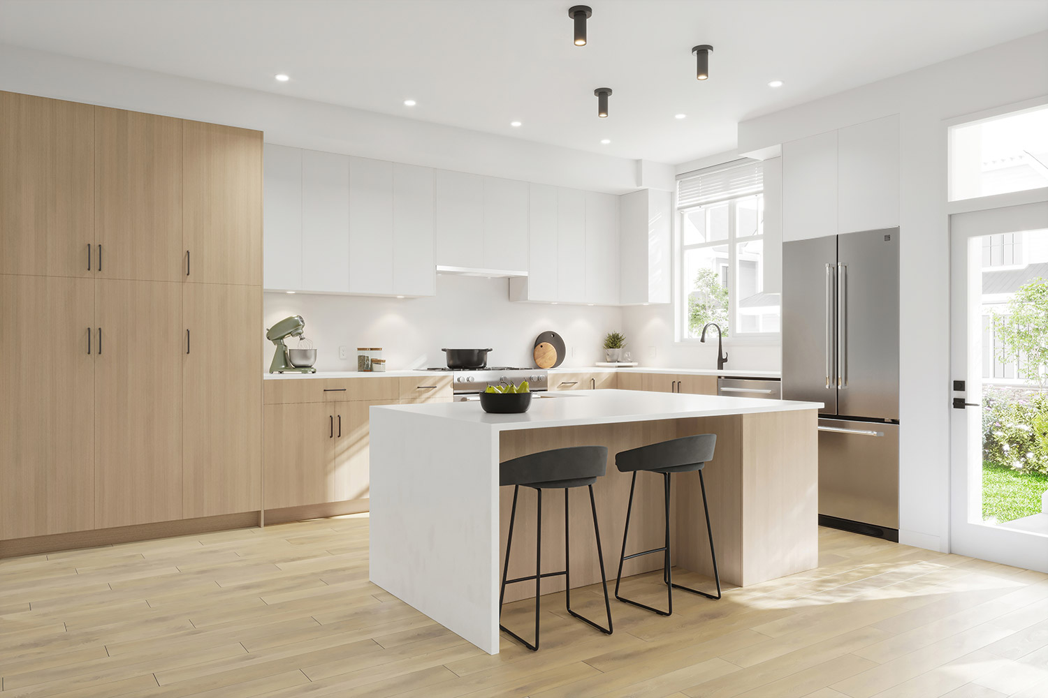 Dawn: A redefined traditional scheme with a modern edge. Offering Snow-White upper cabinetry, and accent light oak cabinets below.